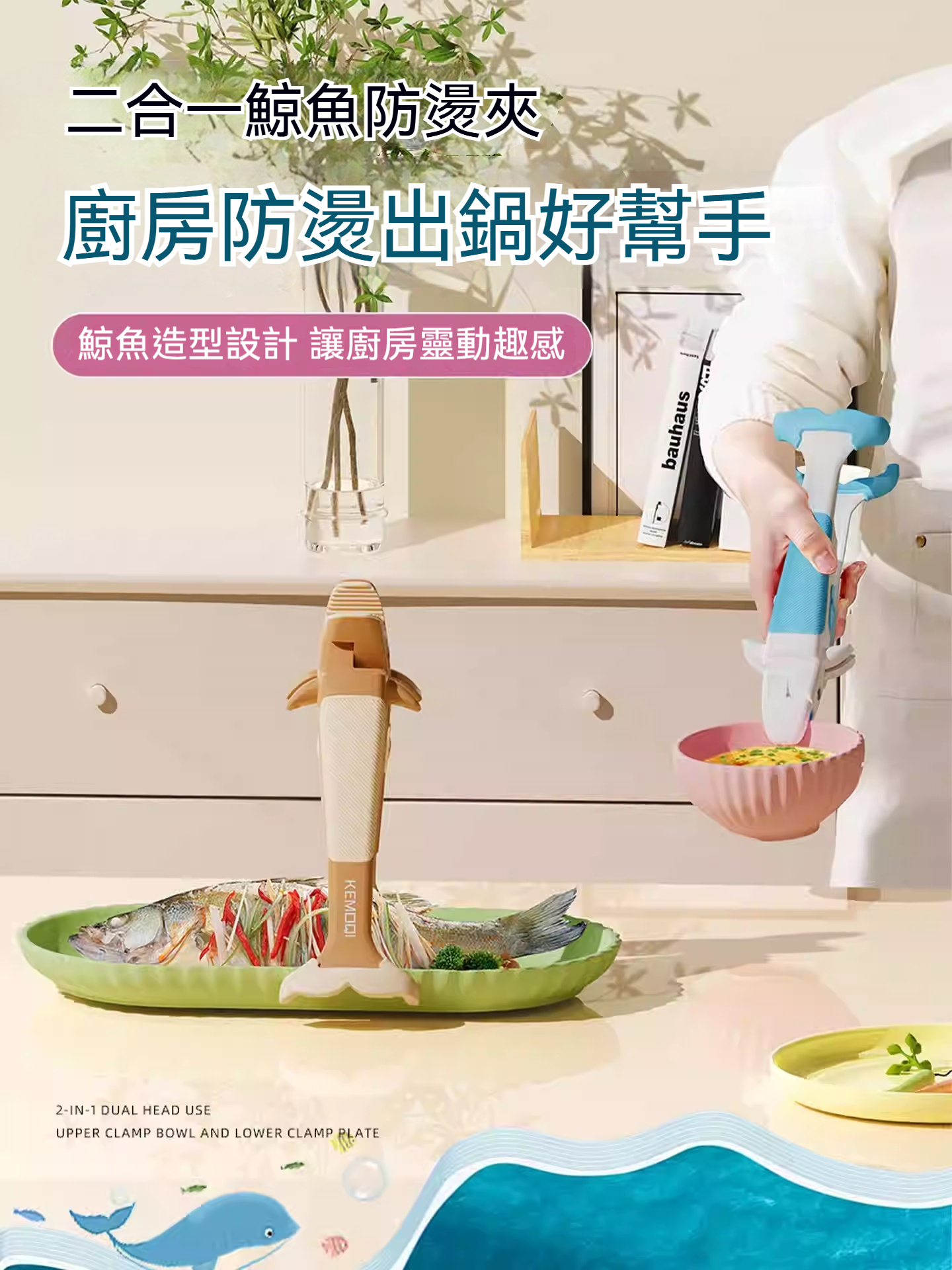 廚房專用二合一鯨魚防燙夾✅波浪紋矽膠夾頭 | 夾得穩、夾的牢✅滑扣式鎖扣收納 | 不佔廚房空間✅防滑紋理手把 | 貼合手掌