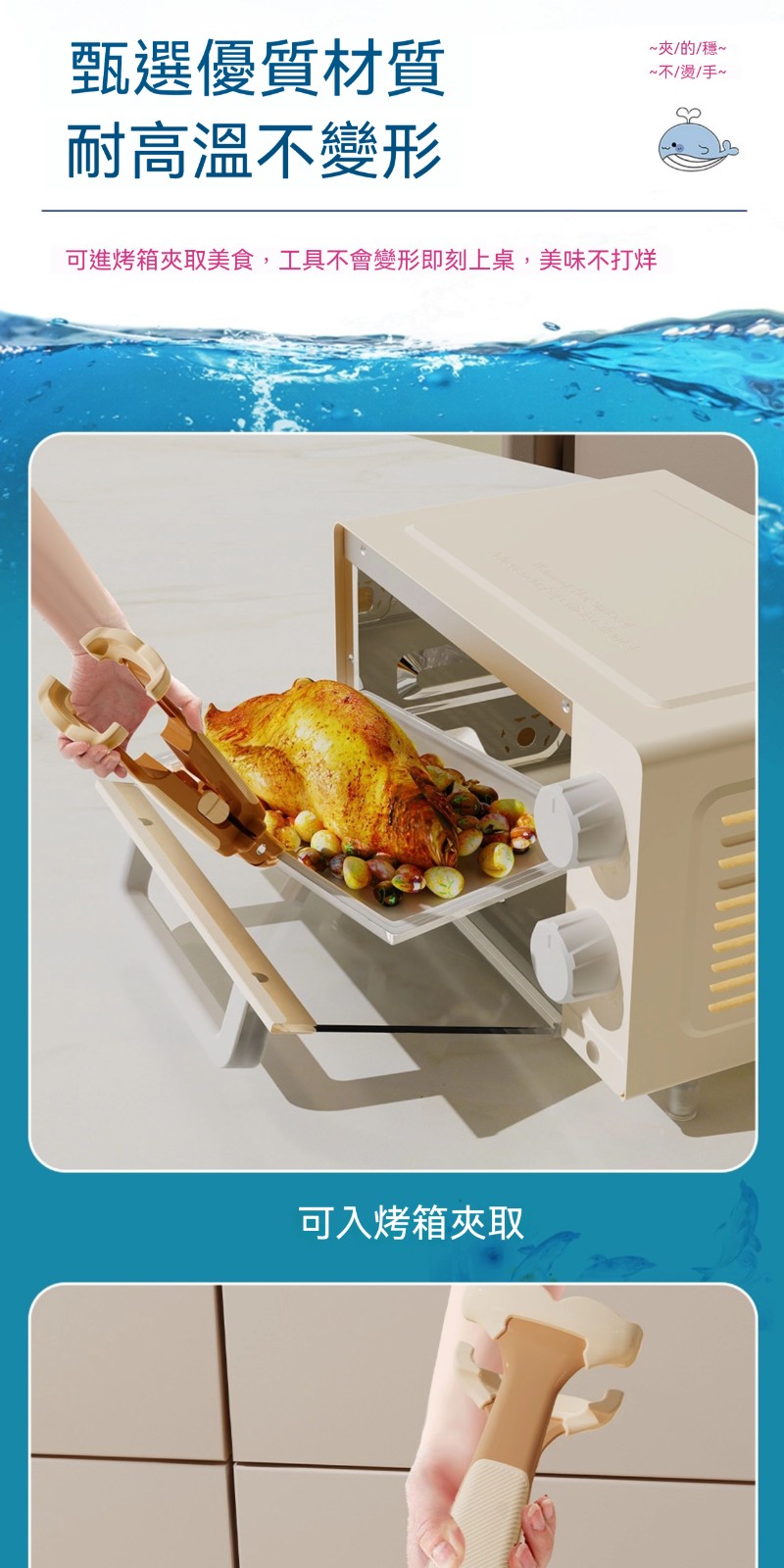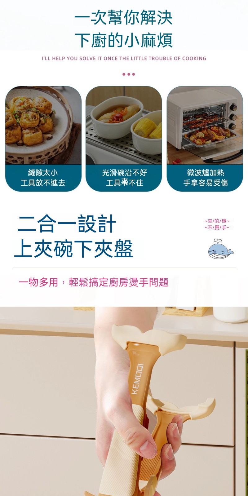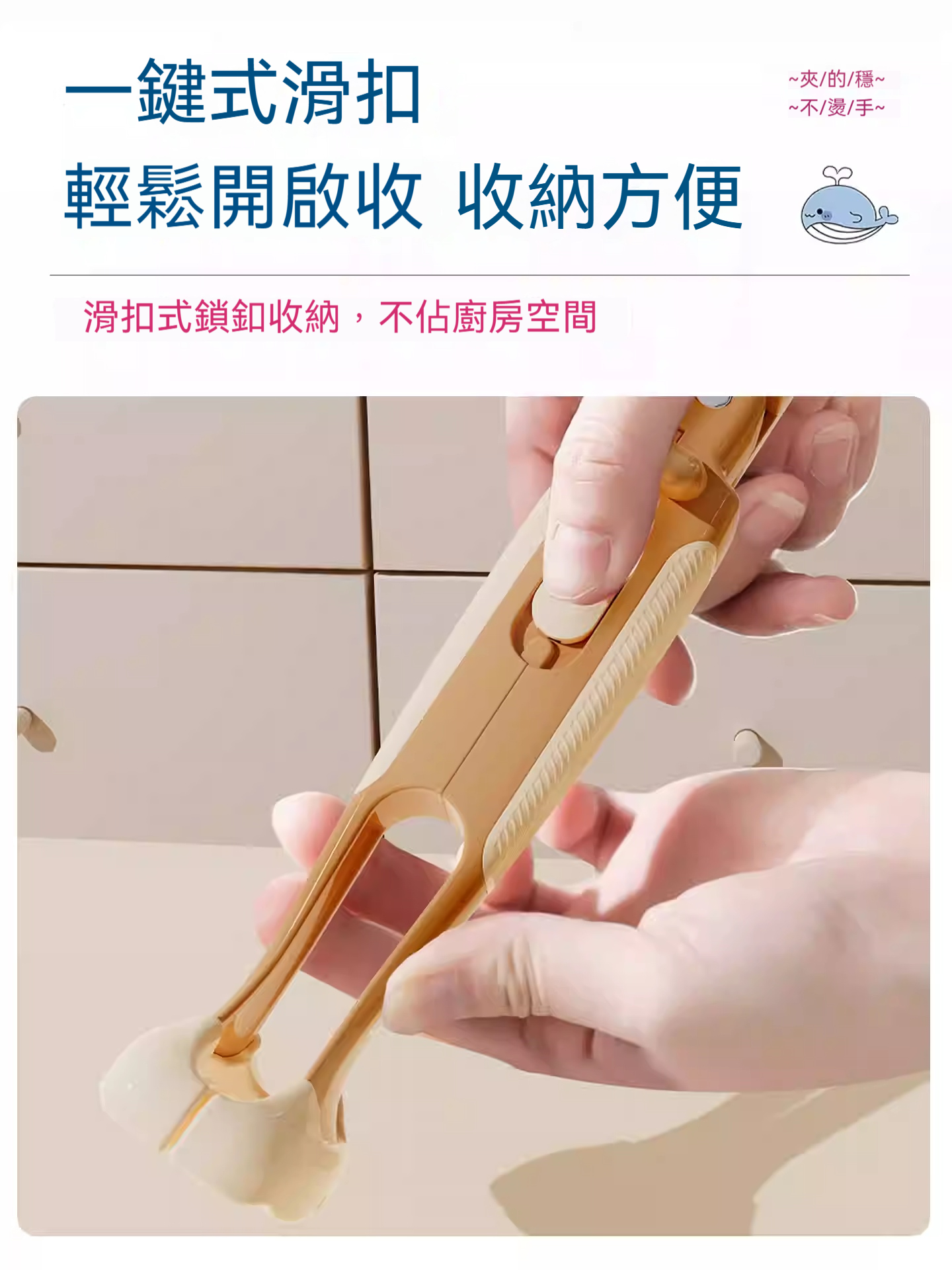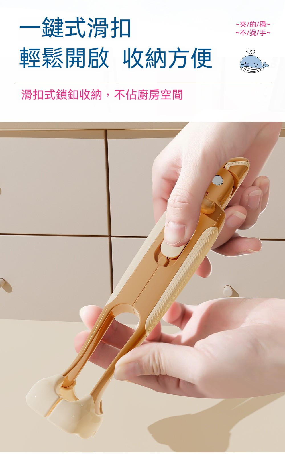 廚房專用二合一鯨魚防燙夾✅波浪紋矽膠夾頭 | 夾得穩、夾的牢✅滑扣式鎖扣收納 | 不佔廚房空間✅防滑紋理手把 | 貼合手掌