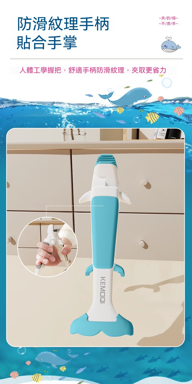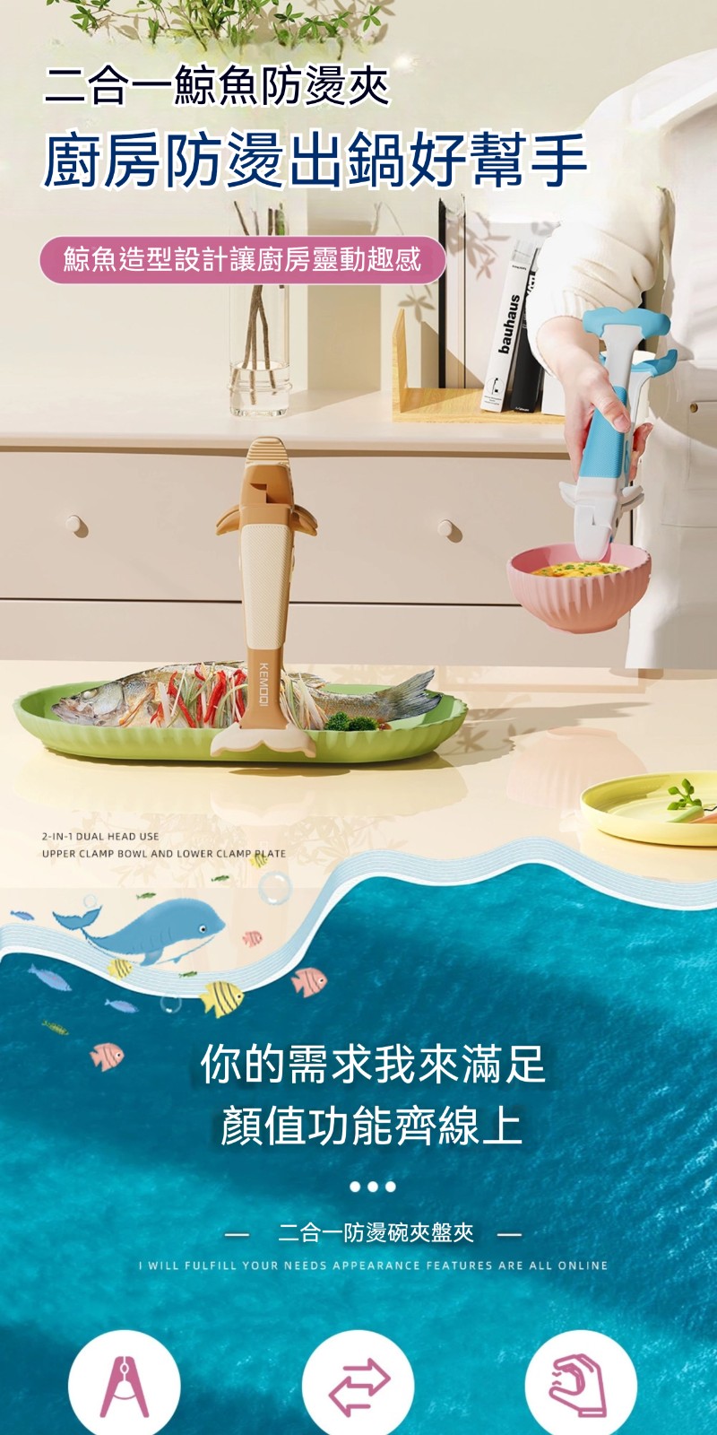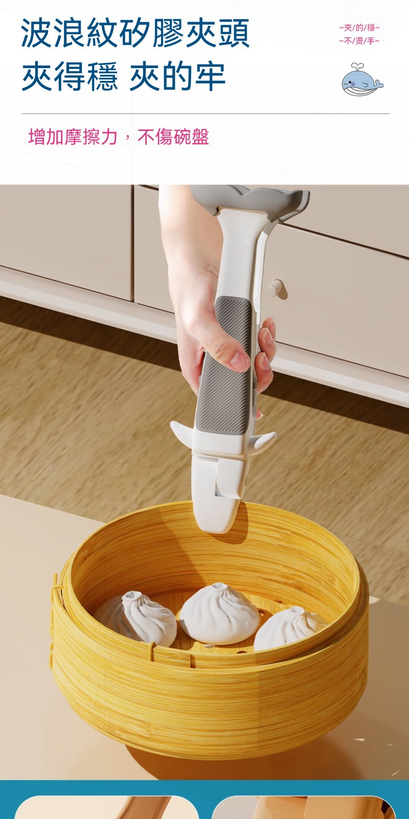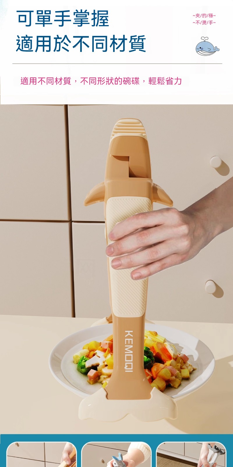 廚房專用二合一鯨魚防燙夾✅波浪紋矽膠夾頭 | 夾得穩、夾的牢✅滑扣式鎖扣收納 | 不佔廚房空間✅防滑紋理手把 | 貼合手掌